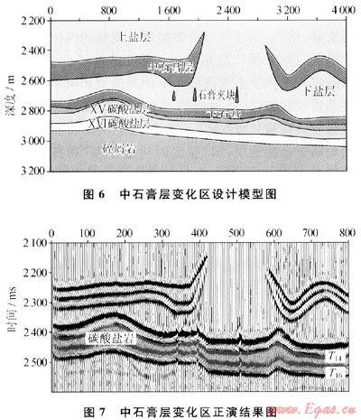 由圖7可見,在中石膏層受擠壓消失或減薄的區(qū)域,碳酸鹽巖頂?shù)捉缑嬖跁r間剖面上出現(xiàn)下拉,形成“眼球”;如果鹽巖中存在石膏夾塊,則引起下覆碳酸鹽巖頂?shù)追瓷渫噍S錯斷,這顯然會使解釋進入誤區(qū)。由此可提示,在石膏層變形較強烈的地區(qū),地震解釋要特別關(guān)注中石膏缺失和減薄的區(qū)域。