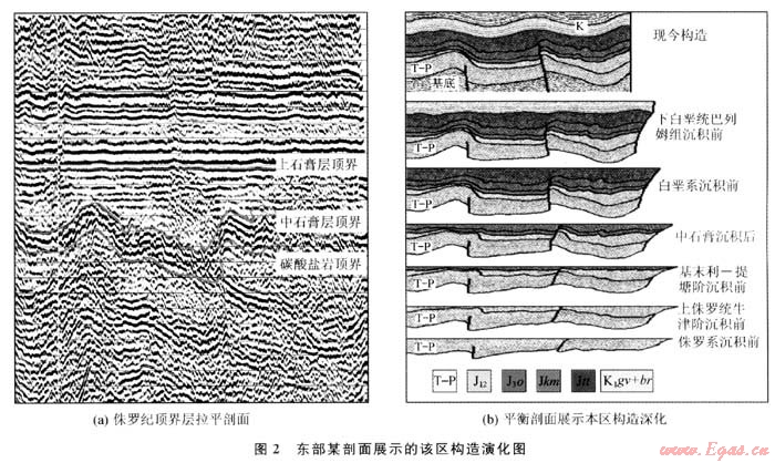 在上侏羅統(tǒng)卡洛夫-牛津階沉積完畢之后,圖蘭地臺回返,中央卡拉庫姆隆起抬升,而阿姆河盆地區(qū)域則繼續(xù)沉降,由此形成了盆地區(qū)域內(nèi)封閉的海洋沉積環(huán)境。沉積了巨厚的鹽膏層。從地震剖面上可以清楚地反映出該套鹽膏層受擠壓后流動變形的形態(tài),以往的認識認為[4],鹽膏層發(fā)生塑性流動的擠壓力是由晚古近世開始的新構(gòu)造運動作用的結(jié)果。但通過平衡剖面和層拉平剖面技術(shù)清晰地反映出了在該套鹽膏層中部的中石膏沉積完畢之后即發(fā)生一期強烈的構(gòu)造運動,該期構(gòu)造運動不僅僅使鹽膏層發(fā)生塑性流動而形變。更重要的是本區(qū)的構(gòu)造格局因此而改變,同時本區(qū)部分構(gòu)造圈閉也在此時形成。