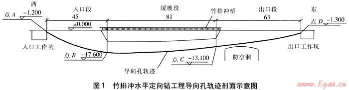 竹排沖水平定向鉆工程導(dǎo)向孔軌跡剖面示意圖見圖1(圖中尺寸單位為m)。
