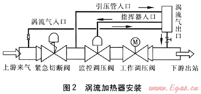 武漢西計量站來自西氣東輸淮武管道的天然氣壓力為5.0MPa,而下游供氣壓力約為1.4MPa。因此,在調壓分輸時,存在較大的節(jié)流。調壓橇采用“緊急切斷閥+監(jiān)控調壓閥+工作調壓閥”的調壓模式。監(jiān)控調壓閥的指揮執(zhí)行機構主要由預調器和指揮器組成,預調器和指揮器中均存在節(jié)流。調壓橇工作時,由于指揮器的出口氣體溫度較低,且天然氣本身含有水或水合物,低溫時水容易冷凝成冰,堵塞指揮器閥口,造成調壓橇工作失效。原來主要采取電加熱的方法防止冰堵,現(xiàn)采用雙通道渦流加熱器取代電加熱器。該雙通道渦流加熱器設計的工作壓力為6.9MPa,試驗壓力為10.3MPa,加熱功率隨上下游壓比的變化而變化。雙通道渦流加熱器可以同時加熱2路天然氣,即1臺加熱器可以同時為2臺調壓閥指揮器加熱。渦流加熱器安裝見圖2。渦流加熱器的渦流氣出口溫度較低,因此渦流氣出口與下游管道之間的連接應盡量短,出口管徑盡量大,彎頭盡量少(最好為直管段),以防止出口管道發(fā)生冰堵。在出口處需安裝一個節(jié)流閥來控制渦流氣流量,以控制加熱溫度。在渦流加熱器渦流氣進口處安裝一個直徑為12.7mm的小球閥,便于控制渦流加熱器的工作。從上游引壓管引入的高壓天然氣經過渦流加熱器加熱后,進入調壓閥指揮器。在指揮器節(jié)流降溫后,天然氣的溫度仍然高于工作狀態(tài)下天然氣的水露點,有效地防止了冰堵。渦流加熱器安裝簡單,所有連接處均可采用卡套接頭連接[5]。