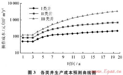 蘇里格氣田儲(chǔ)層非均質(zhì)性強(qiáng)烈,有效儲(chǔ)層規(guī)模小且變化大,本文參考文獻(xiàn)[1]、[2]對(duì)該氣田儲(chǔ)集層進(jìn)行了Ⅰ類、Ⅱ類、Ⅲ類的分類。其氣井生產(chǎn)特征如下:①單井產(chǎn)量低,壓力下降快;②氣井投產(chǎn)后,自然穩(wěn)產(chǎn)期短,早期遞減速度較快,后期較慢,單井經(jīng)濟(jì)累計(jì)產(chǎn)量??;③氣井在自然穩(wěn)產(chǎn)期,單位采氣成本較低,在遞減生產(chǎn)期后期單位采氣成本上升較快;④在低投資、低成本條件下,Ⅰ類、Ⅱ類井具有一定的經(jīng)濟(jì)效益,Ⅲ類井在目前經(jīng)濟(jì)、技術(shù)條件下無經(jīng)濟(jì)效益。
