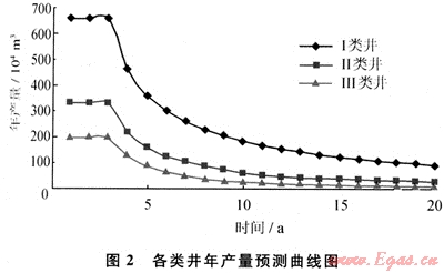 圖2表明,在自然穩(wěn)產(chǎn)期各類井日產(chǎn)量差別較大,Ⅰ類井為2.0×104m3/d、Ⅱ類井為1.0×104m3/d、Ⅲ類井為0.6×104m3/d。同時(shí),Ⅰ類井在進(jìn)入遞減生產(chǎn)初期遞減幅度最大,Ⅱ類井次之,Ⅲ類井遞減幅度最小。因此,隨著遞減生產(chǎn)時(shí)間的延長(zhǎng),Ⅰ類井、Ⅱ類井、Ⅲ類井的產(chǎn)量差距逐步減小。而不同類型氣井產(chǎn)量變化的共同特點(diǎn)是初期遞減快,后期遞減逐漸變小。