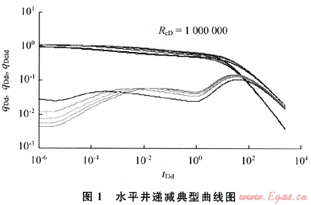 采用Stehfest反演算法[7~8],把qDd-tDd、qDdi-tDd以及qDdid-tDd繪制在雙對(duì)數(shù)坐標(biāo)圖上,就得到了考慮井筒存儲(chǔ)效應(yīng)和表皮效應(yīng)的水平井產(chǎn)量遞減典型曲線(xiàn)圖版(圖1)。水平井遞減典型曲線(xiàn)的特征有:①氣藏中的水平井達(dá)到擬穩(wěn)態(tài)時(shí),產(chǎn)量將急劇下降;②導(dǎo)數(shù)曲線(xiàn)存在早期、中期和晚期三段,早期為垂直徑向流階段,中期為平面徑向流階段,晚期為圓形封閉外邊界控制流階段j③與直井遞減典型曲線(xiàn)圖版相比,水平井遞減典型曲線(xiàn)在流動(dòng)中期有一典型的“臺(tái)階”特征。