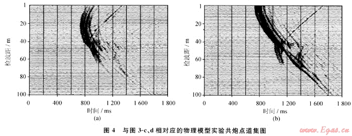 圖3為兩個(gè)楔形模型的射線追蹤圖,比較可以發(fā)現(xiàn),對(duì)于尖滅傾斜層來(lái)說(shuō),激發(fā)井相對(duì)地層為下傾或接收井相對(duì)地層為上傾時(shí)(圖3-b、圖3-d),其經(jīng)過(guò)尖滅傾斜層射線明顯多于上傾激發(fā)或上傾接收(圖3-a、圖3-c)。顯而易見(jiàn),利用下傾激發(fā)上傾接收的井間資料進(jìn)行偏移成像或?qū)游龀上?,其得到的結(jié)果肯定優(yōu)于上傾激發(fā)下傾接收的結(jié)果。圖4是與圖3-c、3-d對(duì)應(yīng)的物理模型實(shí)驗(yàn)炮集記錄,也表現(xiàn)出同樣的結(jié)果。數(shù)值模擬和物理模擬結(jié)果均表明下傾激發(fā)、上傾接收得到的井間記錄能更好地反映井間介質(zhì)的變化。