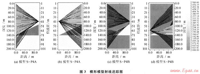 模擬結(jié)果表明,在設(shè)計(jì)井間地震觀測(cè)系統(tǒng)時(shí),應(yīng)當(dāng)力求將射線的入射角控制在臨界角以?xún)?nèi)。同時(shí),為了更好地反映井間介質(zhì)的變化,應(yīng)該采取下傾激發(fā)、上傾接收的方式。因此,物理模型實(shí)驗(yàn)可以為野外井間觀測(cè)系統(tǒng)設(shè)計(jì)提供直觀的依據(jù)。