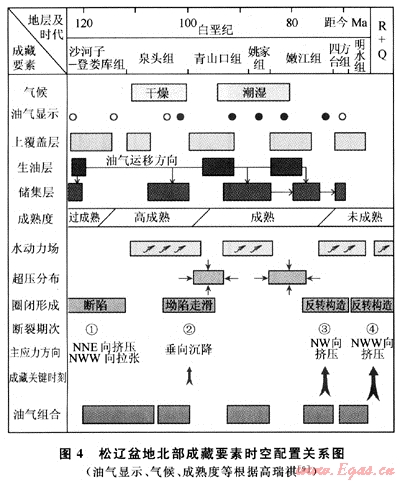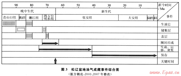 1) 松遼盆地晚期各種成藏要素在時間上和空間上形成了良好的配置關(guān)系,這為油氣在淺部地層成藏提供了基本的條件,淺層油氣是沿斷層向上運移的結(jié)果。確定晚期成藏調(diào)整的關(guān)鍵時刻是明水期-依安期末。