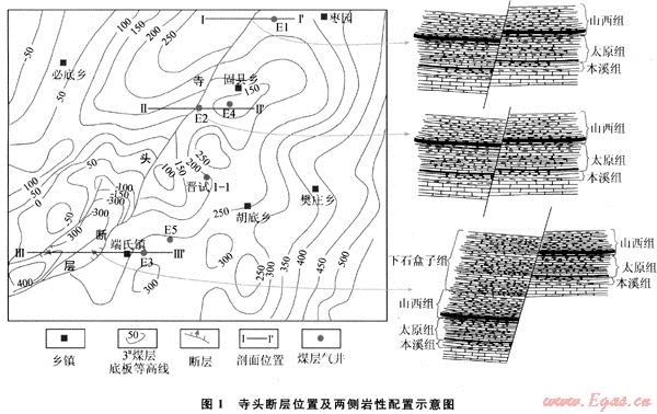 寺頭斷層位于沁水盆地東南部地區(qū),斷層走向變化較大,在端氏以北,走向?yàn)?0°~25°,端氏以南變?yōu)?0°左右,傾向NW,傾角為70°~85°。斷層落差變化范圍較大,在寺頭一帶最大,超過360m,向南北兩端變小。以往研究與實(shí)際勘探資料表明寺頭斷層對(duì)其東西兩側(cè)的潘莊一樊莊煤層氣藏和鄭莊煤層氣藏的水文地質(zhì)條件j構(gòu)造格局和煤層氣的賦存都具有明顯的控制作用[17~19]。因此探討寺頭斷層封閉機(jī)理對(duì)評(píng)價(jià)斷層兩側(cè)的煤層氣成藏具有重要的意義。