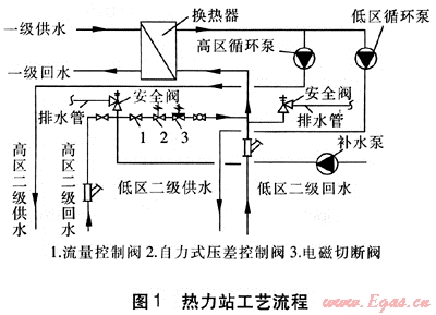 熱力站的工藝流程見圖1。高低兩區(qū)回水管道進(jìn)入熱力站后,高區(qū)二級(jí)回水首先經(jīng)過站內(nèi)除污設(shè)備,再經(jīng)過流量控制閥、自力式壓差控制閥等裝置,對(duì)高區(qū)二級(jí)回水的流量和壓力進(jìn)行調(diào)整后,與低區(qū)二級(jí)回水共同匯入站內(nèi)回水總管進(jìn)入換熱器換熱,然后由供水管道輸送到各自的循環(huán)泵進(jìn)行供熱。為避免出現(xiàn)高低區(qū)搶水的現(xiàn)象,在高區(qū)進(jìn)站回水管道上安裝自力式流量控制閥,通過自力式流量控制閥對(duì)高區(qū)供熱系統(tǒng)的流量進(jìn)行控制,保證了高區(qū)循環(huán)泵不對(duì)低區(qū)產(chǎn)生搶水現(xiàn)象[1]。在高區(qū)二級(jí)回水管道上安裝常開式電磁切斷閥,以備供熱期間熱力站突然停電時(shí)能夠迅速隔斷高低區(qū)供熱系統(tǒng)。這樣,在自力式壓差控制閥、流量控制閥、電磁切斷閥等設(shè)備的共同協(xié)作下,形成了高層建筑高區(qū)與與低區(qū)供熱系統(tǒng)直接連接的供熱形式。
