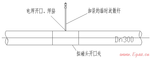 首先仍然是關(guān)閉閥1和閥2,通過(guò)放散口1.2將管內(nèi)天燃?xì)夥派?,放散完成后(火炬點(diǎn)不著),在碰頭開(kāi)口處用電焊焊上一提前預(yù)制好的簡(jiǎn)易放散桿,如圖示: