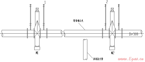 在天然氣中高壓管線上,一般2~3KM(有的甚至長(zhǎng)達(dá)5KM)方有控制閥門,下以長(zhǎng)3KM的DN300鋼管兩閥中間部分需斷管碰頭為例簡(jiǎn)單說(shuō)明:(如下圖示)