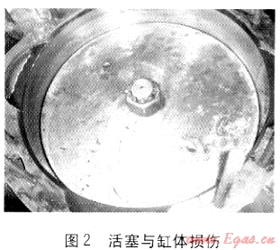 拆卸壓縮機發(fā)現(xiàn)吸排氣閥積碳結(jié)垢過多,閥片、彈簧損壞,升程控制器撞擊導(dǎo)向面,接觸過緊,閥片卡死或折斷,導(dǎo)致破損閥片掉入缸內(nèi),損傷氣缸和活塞。圖2為缸體被碎閥片劃出一條長溝、活塞損壞的情況。
