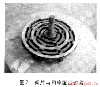 b. 對吸排氣閥進行分組選擇裝配,防止閥片與閥座配合過緊、卡死而加大壓縮機工作阻力。在吸氣閥的組裝過程中,很多操作人員憑借經(jīng)驗和感覺組裝吸氣閥。若壓縮機吸氣閥及運動部件的尺寸公差裝配不當(dāng),極易發(fā)生閥片與閥座配合過緊卡死或徑向斷裂的現(xiàn)象。圖3是閥片與閥座配合過緊。