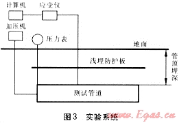 通過(guò)實(shí)驗(yàn)分析,可以準(zhǔn)確了解埋地燃?xì)夤艿赖氖芰η闆r,而且,實(shí)驗(yàn)也是驗(yàn)證有限元法計(jì)算結(jié)果準(zhǔn)確性的重要手段。實(shí)驗(yàn)系統(tǒng)見(jiàn)圖3。