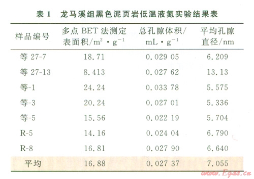 為進一步研究四川盆地南部龍馬溪組泥頁巖的孔隙大小分析特征,開展了孔隙大小精確度可達到0.35nm的低溫液氮實驗。實驗采用的設備為Autosorb-1型比表面積孔徑測定儀,測試結果表明(表1);龍馬溪組具有很小的孔隙直徑,平均僅為7.055 nm;低溫液氮吸附等溫線均呈現(xiàn)“板狀環(huán)”,也反映出龍馬溪組孔隙以微孔為主(孔徑小于50 nm)。