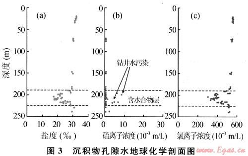 地球化學(xué)識別主要基于海底淺表層沉積物、沉積物中的自生礦物及底水的綜合分析和研究。淺層沉積物和底層海水的甲烷濃度異常高,通過對烴類氣體運(yùn)移路徑的追蹤可以間接識別和評價(jià)天然氣水合物;淺層沉積物孔隙水含量和異常是識別水合物層的依據(jù),一般來說,含天然氣水合物的沉積層的孔隙水鹽度和氯度會降低(圖3)。其次孔隙水中的氧化-還原電位和硫酸鹽含量的降低也可能是天然氣水合物存在的標(biāo)志[8]。