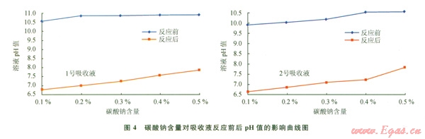 實(shí)驗(yàn)考查無(wú)水碳酸鈉加量對(duì)吸收液吸收效果的影響,制作了兩套吸收液l號(hào)(水+4%膨潤(rùn)土+不同濃度無(wú)水碳酸鈉)、2號(hào)(水+4%膨潤(rùn)土+0.2%除硫劑+不同濃度無(wú)水碳酸鈉)進(jìn)行實(shí)驗(yàn),結(jié)果見圖3、4。