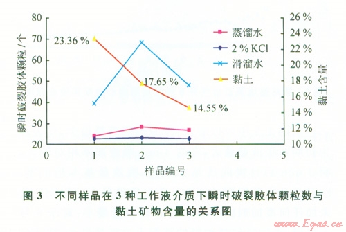圖2顯示了頁(yè)巖的水化分散速度(m)與黏土礦物含量的關(guān)系。2%KCl及蒸餾水在高黏土礦物含量下,具有較好的抑制性能,而在低黏土礦物含量下,其抑制性能對(duì)黏土礦物含量的變化不敏感;而滑溜水的抑制性能相對(duì)較差,但其抑制性能與黏土含量相關(guān)。圖3顯示了瞬時(shí)形成膠體顆粒數(shù)目(b)值與黏土礦物含量的關(guān)系。3種液體都顯示出在高黏土礦物含量情況下,抑制性能較好。