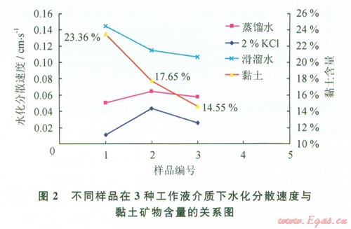 從表2可以看出:①l號(hào)樣品測(cè)試結(jié)果中,2%KCl的頁(yè)巖的水化分散速度(m)值最小,瞬時(shí)形成膠體顆粒數(shù)目(b)值也最?。欢锼?span lang="EN-US">A號(hào)兩項(xiàng)參數(shù)均最高。②2號(hào)和3號(hào)樣品測(cè)試結(jié)果與l號(hào)樣品結(jié)果規(guī)律一致。