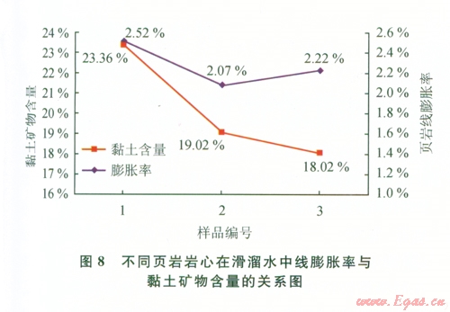 通過對(duì)實(shí)驗(yàn)結(jié)果的綜合分析,認(rèn)為頁(yè)巖的膨脹性與黏土礦物含量存在一定的相關(guān)性,當(dāng)黏土礦物含量變化較大時(shí),頁(yè)巖的膨脹率與黏土礦物含量關(guān)系更為密切。