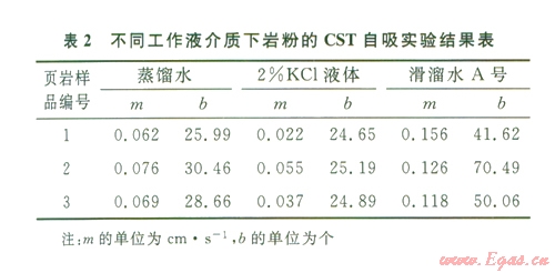 分別采用巖粉CST(毛細(xì)管吸入時(shí)間)法、巖心CST法、巖心層理面或人工縫的CST法來評(píng)價(jià)不同工作液介質(zhì)作用下頁(yè)巖的水化分散特征、吸收外來液體的特征以及不同裂縫特征下頁(yè)巖吸收外來液體的特征。