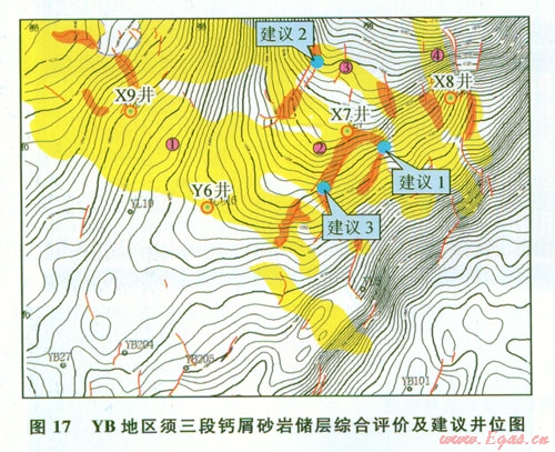 通過鈣屑砂巖沉積特征分析,確定鈣屑砂巖沉積在水退層序頂部的分流河道中,利用沉積相、地震屬性分析,實現(xiàn)鈣屑砂巖分布預(yù)測;通過區(qū)域應(yīng)力場,局部應(yīng)力、構(gòu)造變形特征分析、裂縫成因演化分析,確定須三段層有利裂縫為網(wǎng)狀裂縫,具有“雜亂反射”特征,利用多種地震屬性實現(xiàn)裂縫預(yù)測;通過儲層上部地層存在的削截現(xiàn)象,實現(xiàn)了短期沉積暴露面分布預(yù)測。結(jié)合以上預(yù)測結(jié)果,實現(xiàn)YB地區(qū)須三段鈣屑砂巖儲層油氣富集區(qū)綜合預(yù)測。預(yù)測結(jié)果顯示油氣富集區(qū)主要集中在鈣屑砂巖發(fā)育帶疊加構(gòu)造裂縫發(fā)育帶,在此基礎(chǔ)上分別在1號、2號、3號砂體提交了3口開發(fā)建議井井位(圖17)。