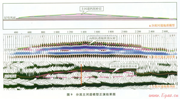 圖9是分流主河道地質(zhì)模型正演結(jié)果與實際地震剖面對比圖。圖9中顯示分流主河道因該具有“高阻抗、透鏡狀、強反射”地震響應(yīng)特征,與實際過井地震剖面特征一致。因此可以利用“高阻抗、強振幅、透鏡反射”預(yù)測分流主河道鈣屑砂巖分布。