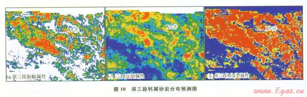 利用振幅屬性、反演屬性、相分類屬性分別對鈣屑砂巖分流主河道的“強振幅、高阻抗、透鏡反射”異常分布進(jìn)行預(yù)測(圖10),最終實現(xiàn)分流主河道分布綜合預(yù)測。