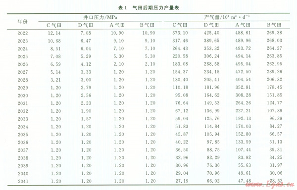 土庫(kù)曼斯坦合同區(qū)某氣田共有ABCD4個(gè)區(qū)塊,40口單井,擬設(shè)4個(gè)集氣總站,氣田地面工程建設(shè)規(guī)模為68×108 m3a。由于各氣區(qū)從2022年將開(kāi)始逐步,因此,就該氣田的增壓工藝方案進(jìn)行了初步探討,以期為后續(xù)設(shè)計(jì)和建設(shè)工作提供參考。