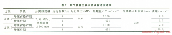 2)方案2:由于在天然氣處理廠集氣裝置集中增壓,因此,導(dǎo)致集氣裝置增壓前設(shè)備和管道的壓力工作范圍波動(dòng)很大(0372 MPa),經(jīng)核算要滿足從0372 MPa工況下氣液分離器的適應(yīng)性,需設(shè)置工作壓力為792 MPa、公稱直徑為2500 mm的臥式氣液分離器9臺(tái)。同時(shí)由于站內(nèi)管道的工作壓力范圍也是0372 MPa,這將導(dǎo)致集氣裝置增壓前管道選型非常困難。以氣液分離器進(jìn)口管道為例,前期開(kāi)啟4臺(tái)分離器,各進(jìn)口管道流速為7 ms,后期由于產(chǎn)量下降,但壓力也急劇下降至03 MPa,需開(kāi)啟9臺(tái)分離器,進(jìn)口管道流速高達(dá)l6 ms(站內(nèi)流速宜小于lO ms,以降低噪聲,減小沖刷腐蝕,確保緩蝕劑附著良好),若為降低后期管道流速,勢(shì)必增加管道管徑,又會(huì)導(dǎo)致前期流速過(guò)低,這種矛盾將十分突出,除了后期新建副管外,基本上沒(méi)有其他解決措施。不同方案集氣裝置主要設(shè)備及管道流速見(jiàn)表7