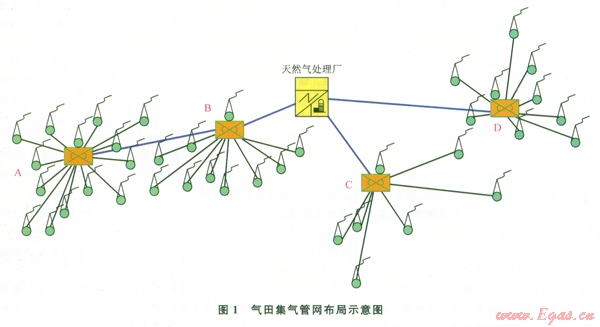 根據(jù)各氣區(qū)單井分布情況,氣田總體上采取多井集氣方案,采用放射狀敷設(shè)管道和多井集氣工藝。氣田集氣官網(wǎng)布局見(jiàn)圖1。