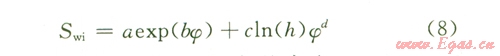 根據(jù)研究區(qū)低阻形成的機(jī)理可知,本區(qū)低阻氣層以細(xì)砂巖、粉細(xì)砂巖為主,顆粒細(xì)、排驅(qū)壓力大、束縛水飽和度較高;低阻氣層中的陽離子交換量很低,因而泥質(zhì)的附加導(dǎo)電性可以忽略。因此,對于這類高束縛水飽和度引起的低阻油氣藏可用以下模型計(jì)算含水飽和度: