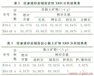 首先對實(shí)驗(yàn)巖心樣品進(jìn)行XRD分析,其結(jié)果見表2、3??梢钥闯觯簬r石骨架部分以長石為主,石英含量次之;黏土礦物含量較少,以綠泥石為主,綠泥石含量在50.0%~75.30%之間。