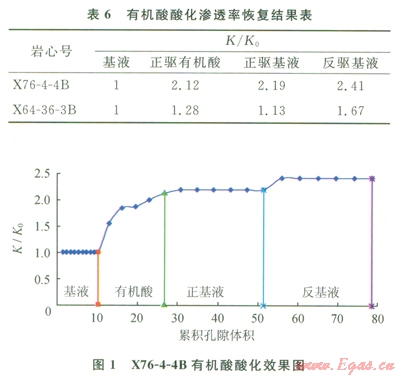 可以看出,采用用有機(jī)酸酸化后,巖樣的滲透率有了明顯的提高。說明酸液配方的選擇對酸敏實(shí)驗(yàn)結(jié)果可產(chǎn)生“質(zhì)變”的影響[9-11]。