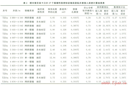 基于上述理論和方法,結(jié)合巖心分析、測井、鉆井、地層流體測試資料,對研究工區(qū)9口井選擇水基(鹽水)鉆井液的l7個層位裂縫性致密砂巖儲層段鉆井液侵入深度進(jìn)行了定量計算,結(jié)果見表2。