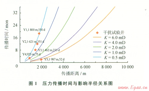 根據影響半徑計算公式,取榆林南儲氣庫建設區(qū)儲層孔隙度為0.06,天然氣黏度為0.02 mPa·s,綜合壓縮系數為0.02 MPa-1,分別對滲透率為0.5~6.0mD等不同條件下傳播時問與壓力影響半徑進行計算,繪制壓力傳播時間與距離關系圖版(圖1)。