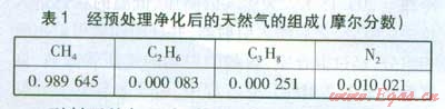 經(jīng)預(yù)處理凈化后的原料天然氣的組成(本文皆為摩爾分?jǐn)?shù))見(jiàn)表l。其溫度為310.00 K,壓力為4.0 MPa,摩爾質(zhì)量為l6.17 9/mol,物質(zhì)的量流量為1.000 kmol/h。