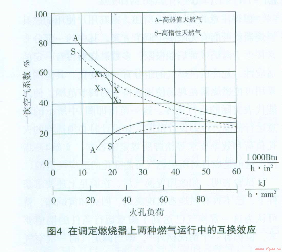 這說(shuō)明用高熱值天然氣調(diào)定后的燃燒器在改用高惰性天然氣置換后,其運(yùn)行工作點(diǎn)x。已高于高惰性天然氣的離焰極限曲線值(見圖4中X1的位置),會(huì)發(fā)生離焰。顯然,如調(diào)定點(diǎn)x置于調(diào)定氣的極限曲線上(一次空氣系數(shù)接近60%一見圖4),則置換后的工作點(diǎn)X1將遠(yuǎn)高于置換氣的離焰曲線(圖上未表示),這一運(yùn)行工況是完全不能接受的。在這一特殊的假設(shè)條件下,如燃燒器的調(diào)定是在同樣的火孔負(fù)荷下,但一次空氣系數(shù)略低于50%(約為42%,其工作點(diǎn)在圖4上用X1表示,則在用高惰性天然氣置換后,一次空氣百分?jǐn)?shù)增加到PAx3=PAX2×1.1744=0.42×1.1744=0.4932即49.30%