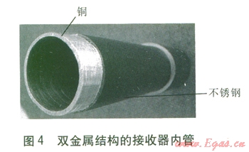 由于接收器的工作壓力高達l0 MPa,綜合考慮成本、效率、安全等因素,通常采用不銹鋼管作為內管,但不銹鋼的熱導率較低,僅為15~18 W/(m·K),而銅可達450 W/(m·K),這易造成接收器周向熱流量和汽液分布不均,甚至發(fā)生彎曲變形,最終導致玻璃外套管破裂、接收器偏離聚焦線。為了解決這一問題,V.Flores等人[8]提出了一種雙金屬結構的接收器內管(見圖4),內層采用具有高熱導率的銅以減小管內傳熱的周向溫差,外層采用不銹鋼以保證內管的工作強度,研究發(fā)現(xiàn)雙金屬結構的內管周向溫差較不銹鋼內管顯著減小。W.Spirkl等人[9]在聚光集熱器中加入二次反射板,將聚光器匯聚的一部分太陽光反射到接收器的另一側。加入二次反射板后,接收器周向接收的太陽能較均勻,但增加了太陽光的反射次數(shù),降低了光效率。