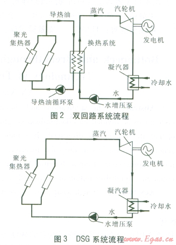 槽式太陽能發(fā)電系統(tǒng)分為雙回路系統(tǒng)(見圖2)、DSG(Direct Steam Generation,直接產蒸汽發(fā)電)系統(tǒng)(見圖3)。