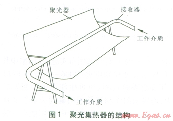 槽式太陽能發(fā)電系統(tǒng)將多個槽型拋物面聚光集熱器經過串并聯(lián)的排列,收集較高溫度的熱能,加熱工作介質,產生蒸汽,驅動汽輪發(fā)電機組發(fā)電。系統(tǒng)包括:聚光集熱器(由聚光器、接收器組成)、換熱系統(tǒng)、工作介質循環(huán)動力設備、汽輪發(fā)電機等。聚光集熱器的結構見圖1。聚光器采用拋物面形,將太陽光反射匯聚到接收器上。接收器由表面鍍有太陽選擇性膜層的鋼管(內管)及玻璃外套管組成,二者之間的空間為真空,以減少傳熱損失。