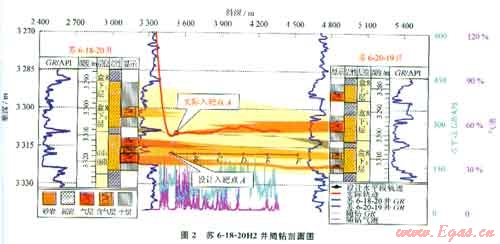 在鉆遇上部砂體頂部時(shí)井斜一般在80°左右,需要穩(wěn)斜基本查明上部氣層情況,如果上部砂層與參照井一致,可繼續(xù)快速下探按原設(shè)計(jì)入靶,而不至于造成過(guò)長(zhǎng)的無(wú)效靶前距。典型井如蘇6-18-20H2井,在鉆遇目標(biāo)砂層組上部單砂體時(shí),砂體厚度變厚,由干層變?yōu)?/span>氣層,后調(diào)整入靶位置在上部單砂體入靶(圖2)。