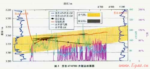 由于蘇里格氣田復(fù)雜的砂體疊置關(guān)系,常見以交錯(cuò)單砂體所引起的“假構(gòu)造”,因此,水平段地質(zhì)導(dǎo)向關(guān)鍵是對(duì)水平井部署區(qū)域目標(biāo)層“真假構(gòu)造”的識(shí)別。但無(wú)論是同一砂體真構(gòu)造,還是由不同砂體形成的假構(gòu)造,水平段施工都不應(yīng)過(guò)分注重設(shè)計(jì)構(gòu)造趨勢(shì)而忽視巖性變化,應(yīng)以“先追蹤砂體、后參考構(gòu)造”的原則靈活調(diào)整導(dǎo)向。以蘇里格氣田中區(qū)水平井施工為例,采取該導(dǎo)向方法取得了顯著效果,全年有5口井采取追蹤砂體導(dǎo)向而偏離設(shè)計(jì)井眼軌跡獲得成功,砂層鉆遇率明顯提高。典型井如蘇東67-07H1井,水平段末端與設(shè)計(jì)井眼軌跡偏差達(dá)11m,而砂層鉆遇率達(dá)到84.4%(圖3)。