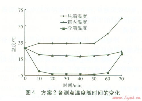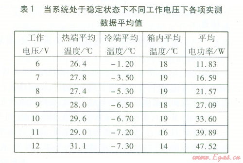 方案l:保持工作電壓為l2 V,散熱風(fēng)扇運(yùn)行,在正常環(huán)境溫度下,測(cè)量各測(cè)點(diǎn)溫度,直至冷端溫度、箱內(nèi)溫度穩(wěn)定為止。然后降低環(huán)境溫度,并記錄各測(cè)點(diǎn)溫度。