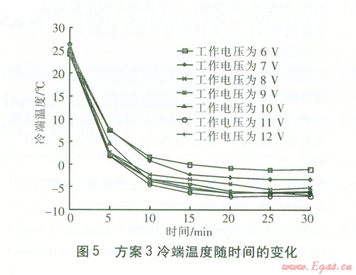 方案3冷端溫度隨時(shí)問的變化見圖5。由圖5可知,對(duì)于不同工作電壓,前16 min,冷端溫度下降明顯,且均降至