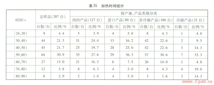 由表25,我們可以得出以下結(jié)論:全部樣品加熱時間分布范圍為24~90 s,其中在30~60 s范圍分布比例較大,冷凝產(chǎn)品、非冷凝產(chǎn)品、國內(nèi)產(chǎn)品與進口產(chǎn)品分布趨勢與總樣品趨勢相同。