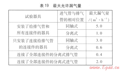 GB 25034-2010標準的第6.2.2條規(guī)定了燃燒系統(tǒng)密封性,在規(guī)定的試驗條件下,器具給、排氣系統(tǒng)泄漏量應(yīng)小于表19的規(guī)定值。