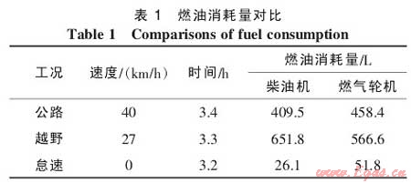 AGT-1500燃氣輪機具有回?zé)嵫b置。按照車輛使用性質(zhì),美國陸軍分別在公路、越野、怠速3種不同工況下對柴油機和燃氣輪機進行實際試驗。表1為該實驗的部分數(shù)據(jù)。