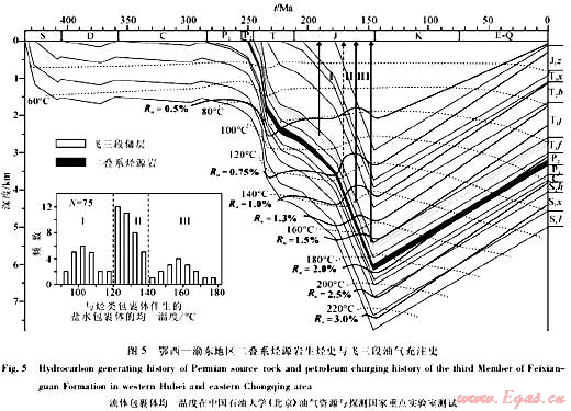 飛三段油氣充注史主要根據(jù)飛三段儲層與烴類包裹體伴生的鹽水包裹體的均一溫度與儲層埋藏?zé)崾反_定。通過鏡下觀察,發(fā)現(xiàn)本區(qū)飛三段儲層膠結(jié)物中可見較多瀝青包裹體和天然氣包裹體,以及少量油包裹體。據(jù)前人研究,瀝青包裹體為油包裹體經(jīng)歷高溫之后的殘留產(chǎn)物[19],因此,可測定與瀝青包裹體伴生的鹽水包裹體的均一溫度代表古原油充注時(shí)的溫度。均一溫度的測定與統(tǒng)計(jì)結(jié)果(圖5):與瀝青包裹體伴生的鹽水包裹體的均一溫度在90~120℃;與天然氣和少量瀝青包裹體伴生的鹽水包裹體的均一溫度在120~140℃;與天然氣包裹體伴生的鹽水包裹體的均一溫度在140~180℃。把這3期均一溫度投影到地層埋藏史圖上(圖5),可知第Ⅰ期和第Ⅱ期大致與二疊系烴源巖的生油期相對應(yīng),而第Ⅲ期與烴源巖的生氣階段對應(yīng)。因此,認(rèn)為飛三段在侏羅紀(jì)主要發(fā)生了3期油氣充注:第Ⅰ期主要為原油充注;第Ⅱ期為原油充注,伴有天然氣充注;第Ⅲ期主要為天然氣充注。第Ⅲ期的天然氣充注,可能主要與儲層古原油裂解產(chǎn)生的天然氣有關(guān)。根據(jù)前人研究成果,認(rèn)為150℃是原油穩(wěn)定存在的上限溫度[20],而飛三段儲層在晚侏羅世的最高溫度接近180℃,表明具備原油裂解作用發(fā)生的溫度條件,飛三段古油藏在晚侏羅世基本全部裂解成氣藏。原油裂解作用發(fā)生的時(shí)間與第Ⅲ期天然氣充注的時(shí)間吻合,進(jìn)一步證明儲層中發(fā)生了原油裂解作用。