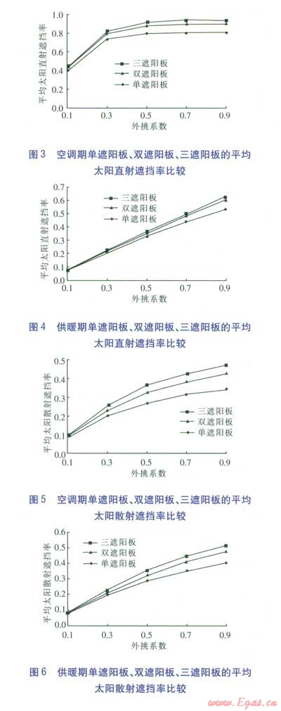①單純考慮太陽(yáng)直射輻射時(shí),單遮陽(yáng)板的外挑系數(shù)宜控制在0.3左右。