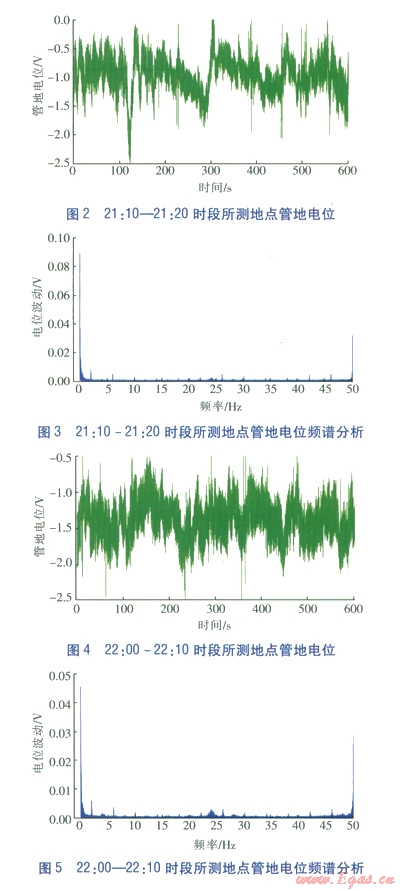 由于測試數(shù)據(jù)量巨大,選取軌道交通不同運行狀態(tài)下各l0 min左右數(shù)據(jù)進行分析,時間段為21:10-21:20、22:00-22:10、00:00--00:10,分別對應(yīng)軌道交通正常運行、軌道交通單列運行、軌道交通停運后。圖2~7為各時段管地電位波動變化及對應(yīng)的頻譜分布圖。